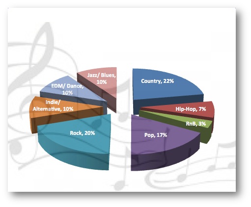 By data mining and including websites that are based on public opinion, the popularity of each genre in our nation is more truthfully represented. We can see that most of America prefers country and rock, rather than the always referred to genre of pop. While I plan on enlarging the dictionary and rerunning this experiment monthly to track the regularity of the statistics, this same process could be used to depict genre popularity in a more specific location as well; for instance, the popularity of each genre in the city of Connecticut or Nashville. As you may predict, the results would be drastically different, unlike the conventional top 100’s that claim to represent the same outcomes for every city across the U.S.. Data analytics such as these have yet to be touched upon in the music industry today, but could seriously reinvent the wheel that we use to evaluate musical preferences. Imagine if a music venue in Boston, Massachusetts were able to accurately showcase the musical opinions of their community before choosing a concert line-up for the upcoming year – this could impact sales for the venue and revenue for the city at large. While they say if it’s not broke, don’t fix it, no one ever said not to make it just a little bit better, and I believe that is exactly what this process could do for the tracking of music in today’s day and age.
