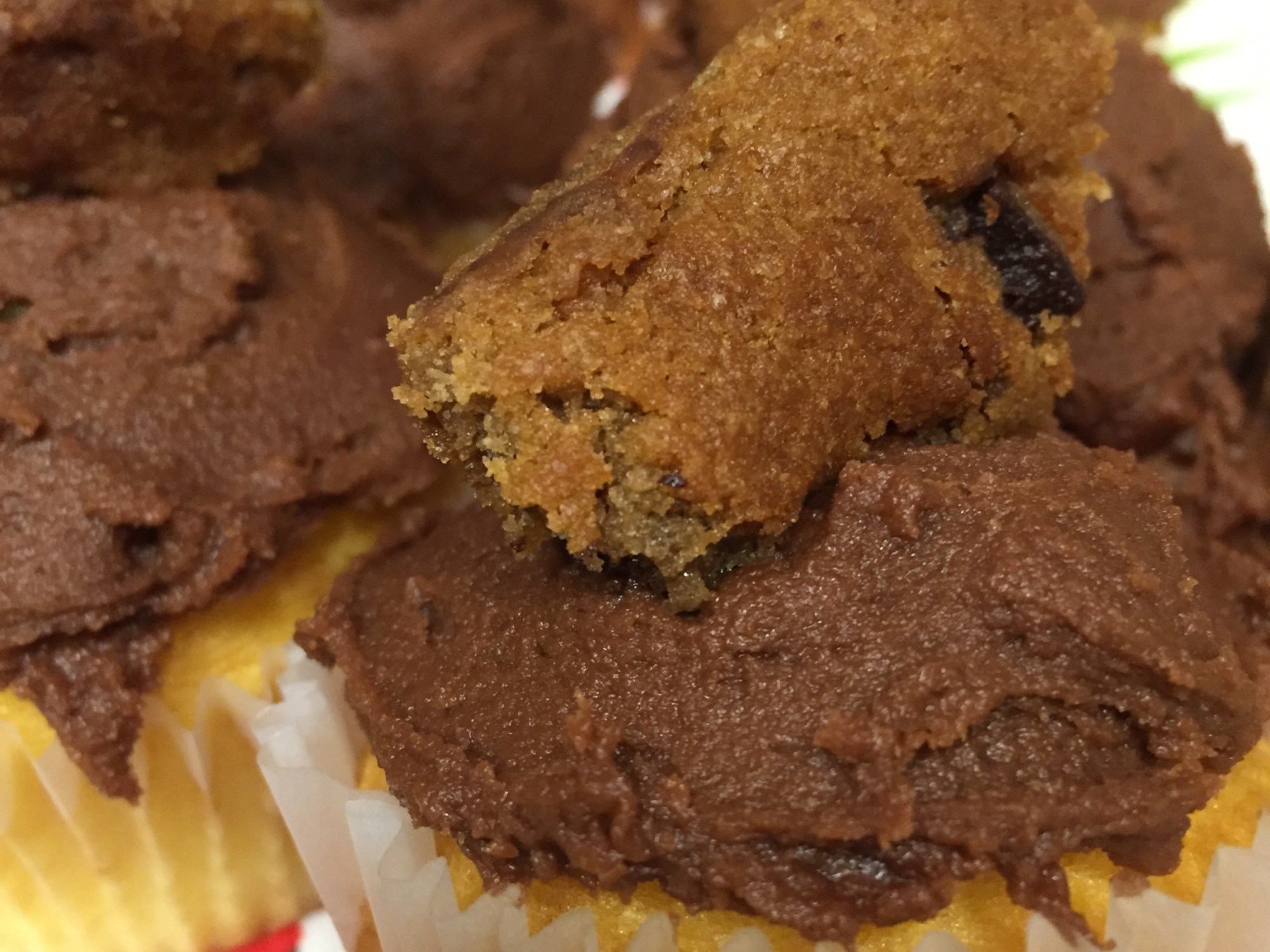 While mixing together the dry ingredients, melt the white chocolate and hot water in a saucepan and allow to cool before incorporating into the batter with the other wet ingredients. Combine everything in a mixer on medium speed until smooth and ladle into lined cupcake tins where your reserved cookie dough will be in each individual cupcake mold. Will make about 16 cupcakes.