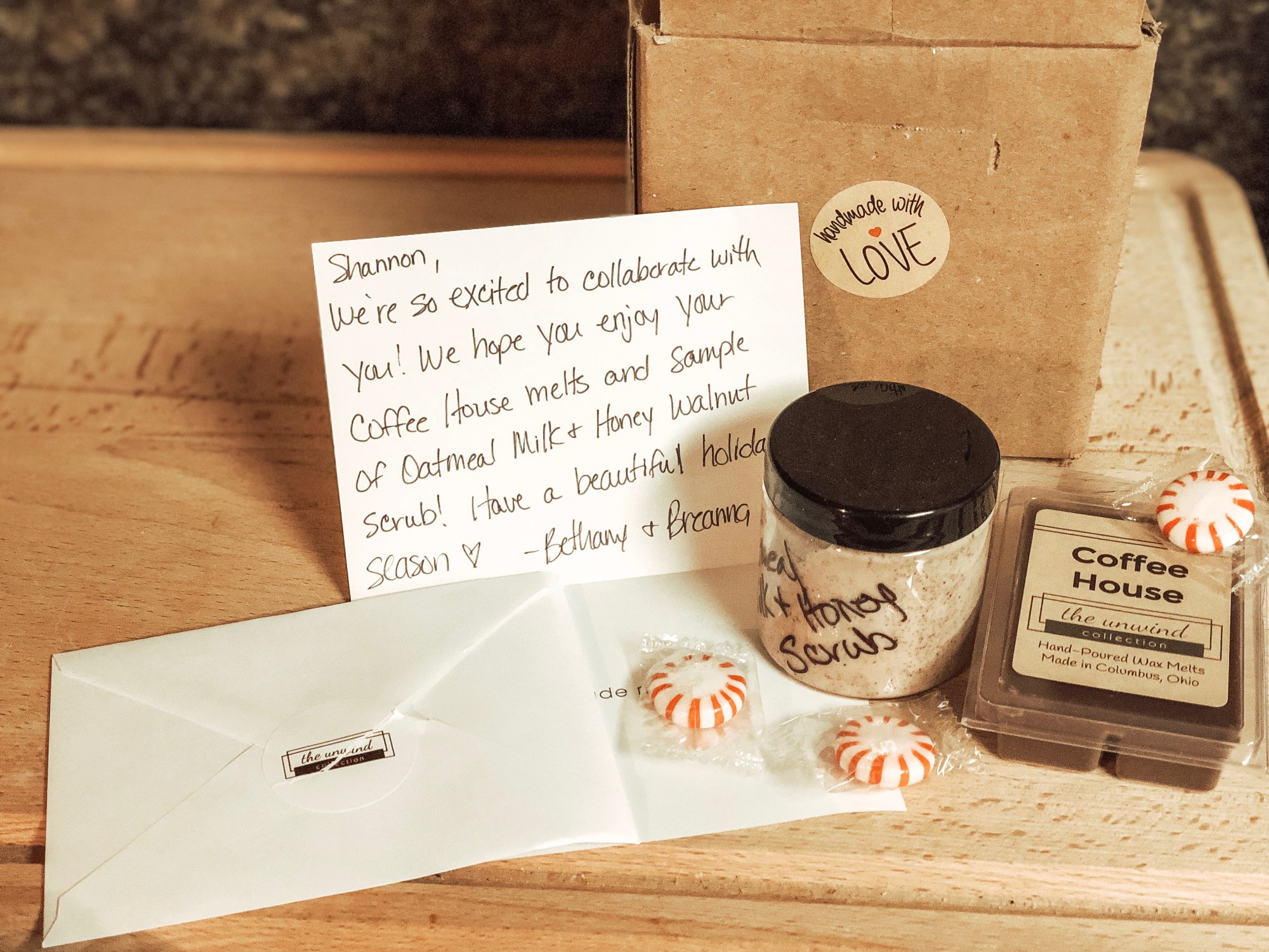 Here’s a snapshot of the adorable package I received from Bethany & Breanna! I am OBSESSED with the body scrub. The hot & cold weather of Nashville this time of year is enough to turn your skin into that of a raisin if you let it – but this product has been my saving grace. The best part is, you can use it sparingly so a little goes a long way!